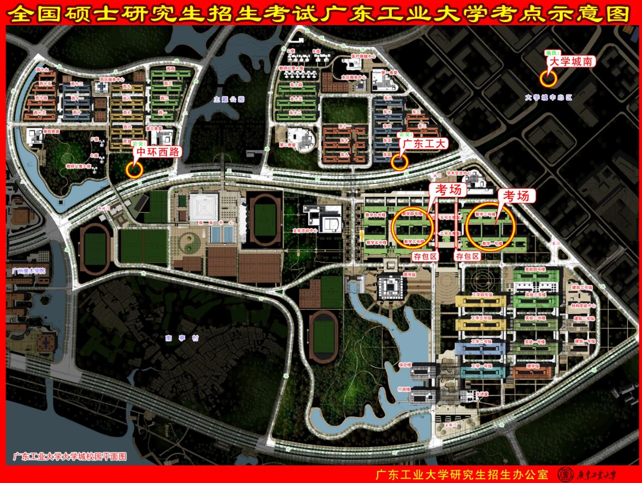本考點地址為廣州市番禺區(qū)廣州大學(xué)城外環(huán)西路100號廣東工業(yè)大學(xué)教學(xué)區(qū)教學(xué)1-4號樓??荚嚻陂g,校外車輛禁止進入校園,建議校外考生乘坐公共交通赴考,并從學(xué)校東北門進校。距離考場較近的公共交通站有:大學(xué)城南地鐵站、廣工(大學(xué)城)公交站等。我??键c考場教學(xué)樓分布及交通站點指引請見下圖。