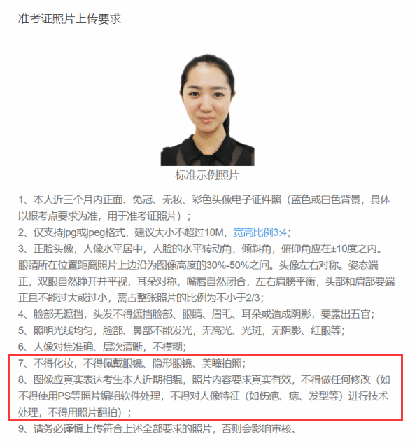 1.本人近三個月內(nèi)正面、免冠、無妝、彩色頭像電子證件照(藍色或白色背景,不得用翻拍照片,不得使用PS等軟件處理圖片);本次采集照片將用于考生準(zhǔn)考證和后期校園卡、學(xué)生檔案等,請務(wù)必認真對待、按要求提供。